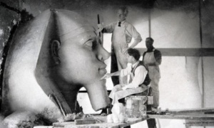Rather than building out of stone to last an eternity, as the ancient Egyptians had intended for their monuments, DeMille’s were intended to last only a few months to accommodate his production schedule.  For cost reasons, and the fact that the sets were needed for such a short period of time, Paul Iribe relied heavily on Plaster of Paris, a product made of gypsum powder, which hardened into a type of cement when mixed with water and dried.  As a paste, it can easily be molded into forms which, in Iribe’s case, became highly detailed Egyptian statues and hieroglyphics.