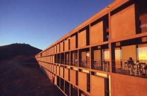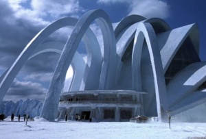 Although I honestly still don’t understand the plot of Quantum of Solace, Dominic Green’s (Mathieu Amalric) lair in the Bolivian desert is a spectacular piece of architecture. Green, a developer of green technology, is using his multi-national corporation to support dictators in order to obtain a share of the world’s scarce natural resources. In short, Green is an Eco-terrorist. His hotel base, identified as an eco-hotel called the Perla des las Dunas, is a linear building that forms a strong contrast to the harsh Chilean desert landscape. In typical Bond fashion Green’s Hotel is destroyed by a series of explosions set off by a hydrogen fuel tank hit by a rampant vehicle. For the shoot the real-life Auer + Weber designed European Southern Observatory (ESO) Hotel Cerro Paranal was designed and built for the use of scientists employed at the neighboring Paranal Observatory.