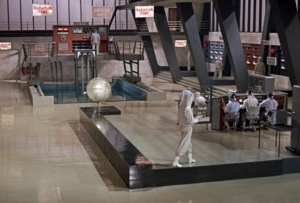 Goldfinger, the third of the Bond installments, is based upon the evil Auric Goldfinger’s (Gert Fröbe) plan to target Fort Knox with a nuclear bomb under a plan called “Operation Grand Slam”. While essentially making U.S. gold reserves radioactive and thus useless, the plan ultimately makes the balance of the world’s gold supply exponentially more valuable. Goldfinger’s own vast gold supply would thus render him the richest man in the world. Being a supervillain, Goldfinger’s evil doings are sustained by his own private support group, including: a private golf club, a car crushing facility to dispose of less than desirable people, an all-female piloted air force led by “Pussy Galore” (Honor Blackman), a murderous sidekick by the name of Oddjob (Harold Sakata), and a kick ass lair. Tucked conveniently away from Goldfinger’s private aircraft runway, his breeding stables and his private prison, the Goldfinger lair contains a high-tech boardroom table, fireplace, pool table and modern furnishings. But, with the flip of a few switches, the welcoming space becomes a formidable control room, containing cutting edge monitoring equipment, detailed models, maps and schematics, and a fully functional command center with the ability to launch any necessary evil plan. Aside from being equipped with an industrial laser, conveniently designed to cut MI6 agents in half, the room can also be completely sealed and filled with deadly gas when required. The exterior scenes of Goldfinger’s lair were filmed at the Stoke Park Golf Club, Buckinghamshire, England. For his company, Auric Enterprises, filming was completed at Pilatus Aircraft Ltd., Ennetbürgerstrasse, Switzerland. As with many Bond films, the Goldfinger lair was filmed on elaborate sets constructed at D Stage, Pinewood Studios, Iver Heath, Buckinghamshire, England, UK.